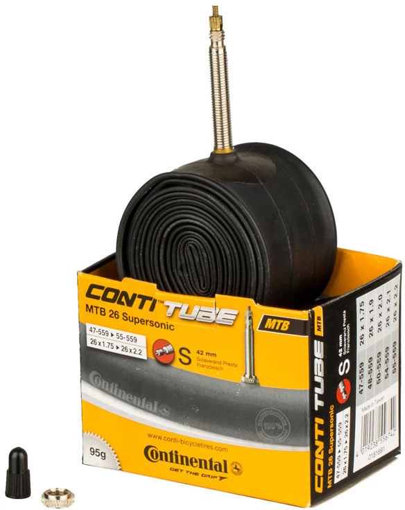 Désignation/synonymes : valve Sclaverand (SV), valve française, valve PrestaDiamètre extérieur : 6,5 mmAutres : la valve est dévissable sur toutes les chambres à air Continental avec valve SV (pour permettre l’utilisation d’un prolongateur de valve ou le remplissage avec un liquide anticrevaison, etc.).Contenu :1 x chambre à air Continental VTT Supersonic